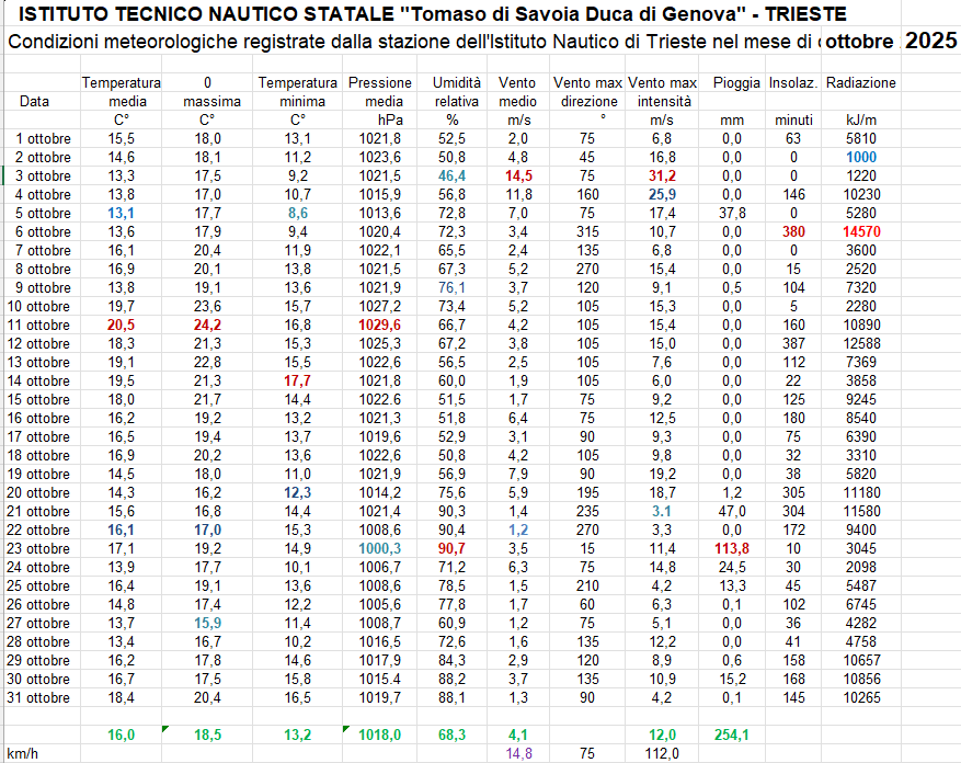 Il mese di ottobre 2025 con i suoi 15,8°C di media è stato perfettamente in linea con i valori degli ultimi 38 anni (da quandosono iniziate le rilevazioni da parte dell'Istituto Nautico). Se consideriamo invece la media degli ultimi 177 anni (da quando esistono dati relativi a Trieste), la temperatura risulta più alta perchè in questo caso la media è di 14,9°C.