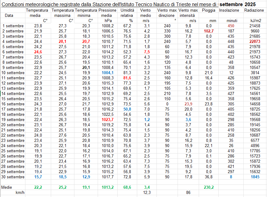 (Dati registrati dalla Stazione Meteorologica dell'Istituto Nautico di Trieste)